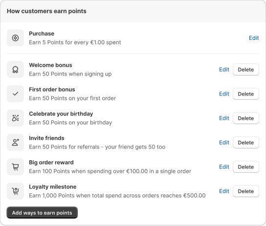 Loyale makes it easier than ever to reward your customers for engaging with your brand. You can set up multiple ways for customers to earn points—automatically and effortlessly. From first orders and birthdays to sign-ups and more, your loyalty program can reward meaningful moments across the entire customer journey.