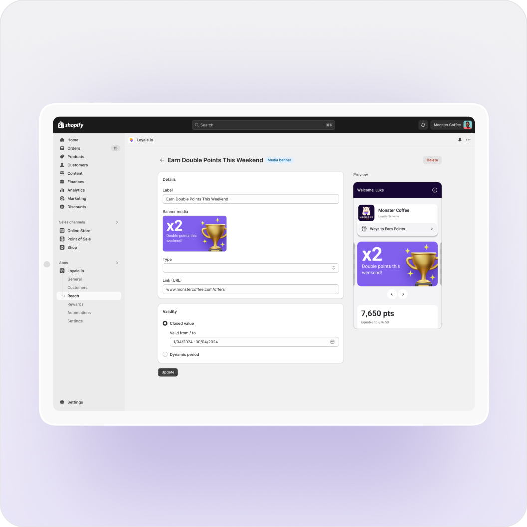 Total Control. Customise rewards, update promotions, and automate campaigns in just a few clicks.